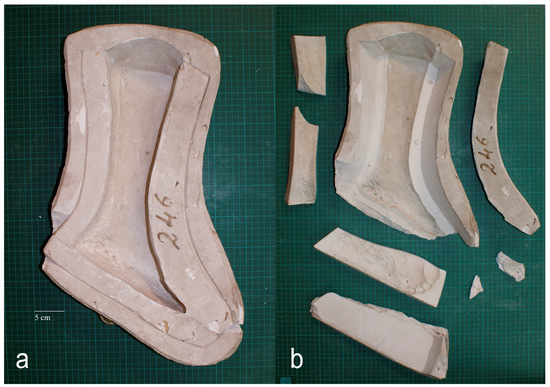 Original plaster mould in its present state: (a) mould set assembled; (b) moulds disassembled to show all parts and fragments.