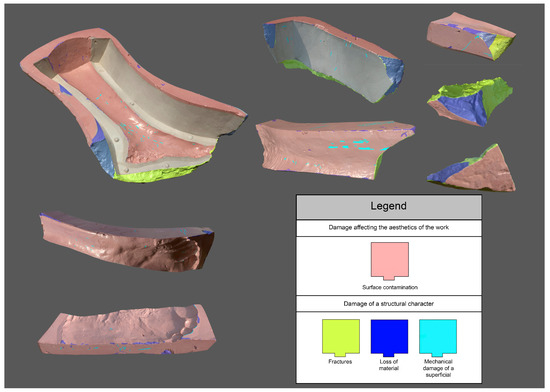 Different studies have used digital technologies to obtain physical reproductions of damaged or missing pieces that needed to be restored or reconstructed. In some of these works, the object was digitized by using photogrammetry or 3D scanning to obtain a virtual model that could be digitally restored and subsequently reproduced on a 3D printer [19,20,21,22,23]. In some cases, in order to obtain a copy in a material that cannot be used in 3D printing, moulds have been generated on the computer from the virtual model [24,25,26]. In this study, however, which lacked the figure in positive, and with the moulds being in a rather precarious state of preservation, it was decided to digitize all of the pieces to obtain a virtual model of each of them. For this task, we used a structured light scanner to acquire accurate high-resolution geometry information. Since the artefact to be scanned was a mould, it was not necessary to calculate a high-quality colour texture by using an image-based technique, such as photogrammetry. Therefore, we only gathered the colour information from the scanner’s camera. Once the mould was printed, it served to create by casting, in beeswax, a replica of the original sculpture. Finally, a polychrome process to recreate the characteristic appearance of the pathology that was represented was conducted, which took as a reference other dermatological models from the same collection.