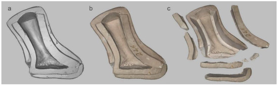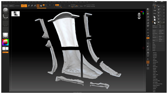 A 3D digital model was created that contains the eight pieces and fragments of the mould that was found in the museum. The mesh had a total of 15.3 million polygons and accurately recorded the smallest details that are observable to the naked eye in the plaster cast (Figure 3).