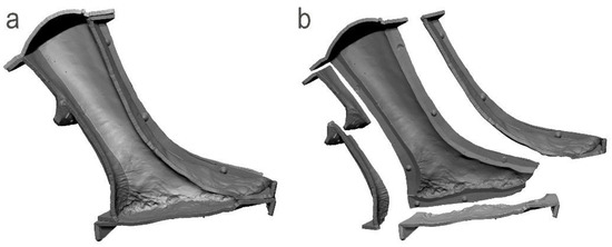 Once the moulds were conveniently divided, all their parts were repositioned to fit perfectly with each other in order to create several matching holes on either side of the joining surfaces for the insertion of fixing screws once printed. This was considered to be a convenient way to keep all the elements fixed in the correct position during the casting process, which minimises the formation of burrs in the joints, and also the outflow of the liquid wax through the cracks that might remain. The holes for the screws were made by means of Boolean subtraction operations, which created cylinders of a suitable diameter that, once placed through the thickness of both moulds in the joining area, were subtracted from them, which left a negative hole. To perform this task, a folder was created for each part of the mould and all of the cylinders that were to be drilled were saved in it. Then, the “Live Boolean” function was activated, and the subtraction icon was marked for each of the cylinders in the “SubTools” list, and finally, the “Boolean Folder” option was executed in the folder containing the mould and the cylinders. Small flaps were also modelled to join those elements of the mould that had been previously divided because they did not have any key in the contact area. These flaps were provided with screw holes by using the same method as described above (Figure 6).
