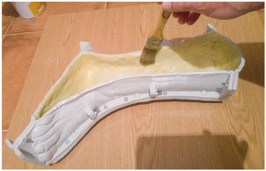 Subsequently, the beeswax was heated with a melter, with the temperature regulated to 70 °C, and, once in a liquid state, it was spread over the entire surface of the mould with a soft-haired brush. The operation was repeated successively with a brush, layer by layer, until the desired thickness was reached (Figure 7).