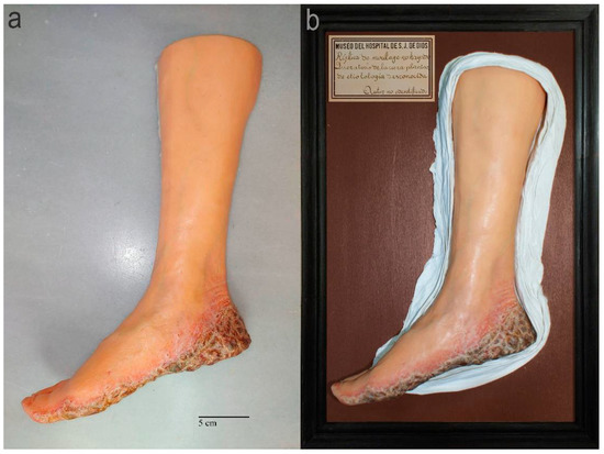 In recent years, the UCM research group (Art, Technology, Image and Conservation of Cultural Heritage) has been collaborating with the Olavide Museum to carry out the 3D digitization of the models that belong to the collection, and to propose new conservation–restoration methods that are based on 3D scanning and 3D printing technologies. In this research, we have analysed a plaster cast, which corresponds to an unfound moulage that represents the inner side of the foot and the distal part of the lower extremity, with a series of irregular-looking skin lesions in the plantar region of unidentified aetiology.