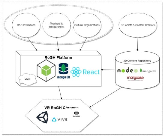 The Digital Routes project’s overall design is portrayed in Figure 1. In the upper layer, end-users and content creators are presented, while in the middle level the two main applications are presented alongside the technologies used for their development, namely: (a) RoGH platform and (b) the 3D Content Repository. Their interaction makes it feasible to provide to end-users the VR chronology (named VR RoGH Chronos by the Greek word “chronos” meaning time) where they can tour the Greek history by choosing place or time and chronological period.