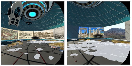 Inevitably, Virtual Reality (VR) and its potentialities can become a “game changer” in terms of enriching users’ experience [] as far as cultural or historical content is concerned. It is obvious that VR is leading digital transformation of the cultural and historical sector [,] by making feasible “VR–time-travels” to buildings, places, and cities of the past. Through virtual reality, modern Greek cities are connected to the historical moment, as the user has the opportunity to become acquainted with and learn about the place and its history and to tour the archaeological remains and historical monuments of the past with the use of appropriate interpretive means.