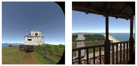 The 3D representations include representations of buildings with full architectural detail and realistic photorealistic depictions (Figure 7 and Figure 8). The 3D modelling used optimal techniques for real-time photorealistic imaging cameras. The same models have been used to produce illustrations. Another special feature of the three-dimensional content of the proposed platform is its high density for use in the production of animation (video), which is optimized in low-density models, but through materials that give it high fidelity for use on real-time content players. A sample of the tower of Prosforion in Ouranoupolis, a well-known historical place, is given in Figure 7 below.