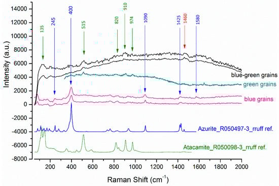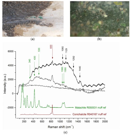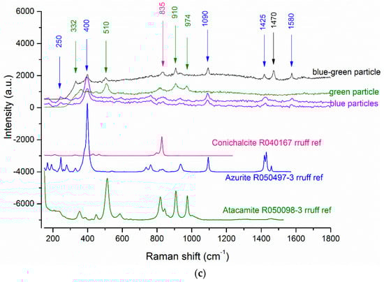 - Coccato, A.; Bersani, D.; Coudray, A.; Sanyova, J.; Moens, L.; Vandenabeele, P. Raman spectroscopy of green minerals and reaction products with an application in Cultural Heritage research. J. Raman Spectrosc. 2016, 47, 1429–1443. [Google Scholar] [CrossRef]