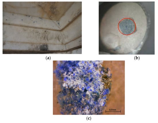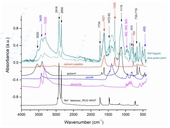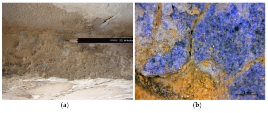 - Lluveras, A.; Boularand, S.; Andreotti, A.; Vendrell-Saz, M. Degradation of azurite in mural paintings: Distribution of copper carbonate, chlorides and oxalates by SRFTIR. Appl. Phys. A 2010, 99, 363–375. [Google Scholar] [CrossRef]