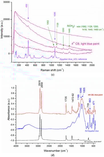| 4th cornice block (W) | Egyptian blue | Vivid light blue | Figure 12c | Figure 12d | Wax, Ca-oxalates |