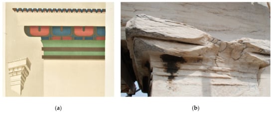 - Aggelakopoulou, E.; Bakolas, A. What were the colours of the Parthenon? Investigation of the entablature’s cornice blocks. J. Archaeol. Sci. 2022, 140, 105553. [Google Scholar] [CrossRef]