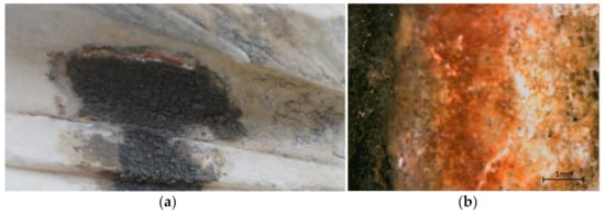 - Polikreti, K.; Maniatis, Y. Micromorphology, composition and origin of the orange patina on the marble surfaces of Propylaea (Acropolis, Athens). Sci. Total Environ. 2003, 308, 111–119. [Google Scholar] [CrossRef]