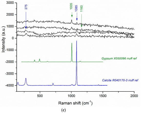 - Castro, K.; Sarmiento, A.; Maguregui, M.; Martínez-Arkarazo, I.; Etxebarria, N.; Angulo, M.; Urrutikoetxea Barrutia, M.; González-Cembellín, J.M.; Madariaga, J.M. Multianalytical approach to the analysis of English polychromed alabaster sculptures: μRaman, μEDXRF and FTIR spectroscopies. Anal. Bioanal. Chem. 2008, 392, 755–763. [Google Scholar] [CrossRef] [PubMed]