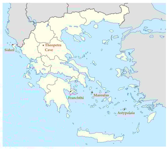 In Greece, the Mesolithic period lasted for approximately two thousand years (9000–7000 BC) and, until the 1970s, relevant archaeological research was limited [8]. Excavations in Franchthi Cave in the Argolid in the late 1960s and early 1970s brought to light Mesolithic deposits and opened new opportunities in the study of the era [9,10]. Since then, and especially during the past twenty years, the archaeological data have been enriched considerably, thanks to the identification of new Mesolithic sites and their subsequent systematic excavations [8,11,12,13,14]. Surface surveys aiming specifically at the identification of Mesolithic sites have also been conducted in Epirus, the Argolid, Northern Sporades, on Meganisi near Leukas and at Plakias in southern Crete [8,15]. More recently, Mesolithic deposits have been also found in the Negros Cave at the island of Astypalaia [16]. In the last few years, the intensification of Mesolithic investigation has offered great insights into our knowledge of this period in Greece.
