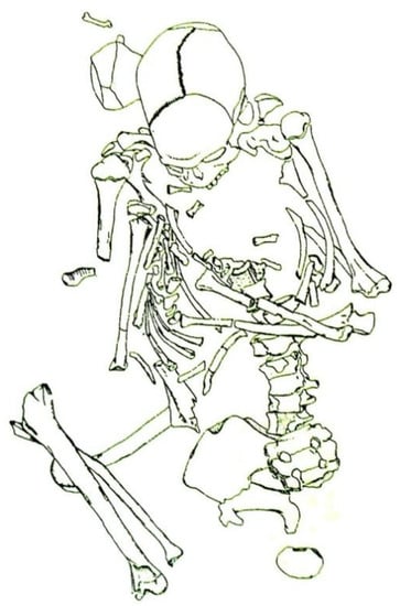 In this deposit, a human burial was found intact in 1993. The body was buried in a filled shallow pit with the skull on a higher level looking straight ahead, while the rest of the skeleton was in a semiflexed position, turned to the right, looking towards the entrance of the cave (Figure 2). A flint implement was found beside the knees and another beside the chest [12,20], but they are appreciated as findings from the fill, not corresponding to the burial itself. The reason for this is that carbons found in the same fill of the pit were dated between 8290–8720 BC and 9090–8300 BC (DEM 315 and 316, respectively), while dating of the bones yielded different ages: 8070 BC ± 60 years (7280–6830 BC—CAMS 21773) [21]. This chronological gap of about 1500 years could only be explained on the basis that the shallow pit was filled with deposits dug in deeper layers.