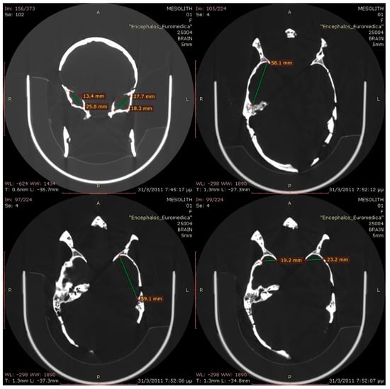 - Papagrigorakis, M.J.; Karamesinis, K.G.; Daliouris, K.P.; Kousoulis, A.A.; Synodinos, P.N.; Hatziantoniou, M.D. Paleopathological findings in radiographs of ancient and modern Greek skulls. Skelet. Radiol. 2012, 41, 1605–1611. [Google Scholar] [CrossRef] [PubMed]