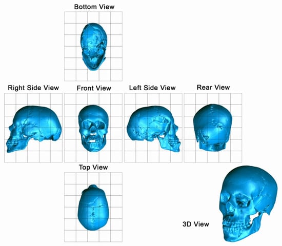 Since the series of CT images covering the head were closely spaced (0.3 mm slice spacing), the 3D-reconstructed model of the skull reproduced very fine details of the original (Figure 7). The bounding box dimensions of the skull were 217 mm height, 134 mm width, and 186 mm depth. Interestingly, a substantial asymmetry between the left and right temporal cavity (in favor of the left) was observed and noted. The entire process of 3D printing took 66 h to be completed, and 479 cc3 of ABS and 236 cc3 of supported material were used. The skull was printed with a layer thickness of 0.245 mm, which corresponds to the highest level of resolution analysis of the Dimension SST 778 3D printer used.