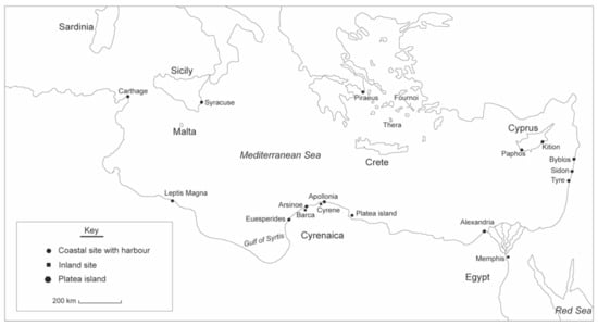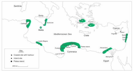 The region of Cyrenaica in today’s eastern Libya is characterised by discrete pockets of arable land, divided by inhospitable desert, which led to multiple waves of settlement, colonisation, and cultural developments. Evidence of pottery production and animal husbandry in the Neolithic period show there were early communities in the area, and it has been noted that the local culture of Cyrenaica differed markedly from that in contemporary Tunisia [8]. Herodotus reported that the first Greek settlers in the area consisted of Dorian Greeks from the island of Thera in the 7th century BCE [9]. According to Herodotus, the traditional founder of this colony was Battus I, who was allegedly told by an oracle to settle in Libya. There, he founded the city of Cyrene (modern-day Shahat), which became the centre of a small state, where his dynasty, the Battiads, ruled from c. 630–440 BCE. The local population of Libyans sought to limit the expansion of the Battiads and requested protection from the Egyptian king Apries, but the army that he sent was swiftly defeated [5]. Alliances shifted soon after, when the Battiads were allied to the Egyptian Pharaohs of the 26th dynasty, such as Amasis II, until the Achaemenids conquered Egypt in 525 BCE. After that, the last rulers became Persian vassals. In c. 440 BCE, the Battiad Dynasty came to an end when Archiselaos IV was killed at Euesperides [10], at which point the monarchy was abolished and Cyrene became a polis state. Following Alexander the Great’s conquest of Egypt in c. 330 BCE, the city came under Ptolemaic suzerainty [11]. When Ptolemaic power waned, the last ruler, Ptolemy Apion—a natural son of Ptolemy VIII Physcon—bequeathed the province to the Romans, meaning soon after he died in 96 BCE, Cyrenaica became a Roman province. This province was also referred to as pentapolis after its five main cities: Cyrene, the port of Apollonia, Eusperides, Arsinoe, and Barca, also known as Barce [12]. The locations of these cities are shown in Figure 1.