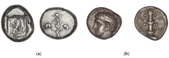 - Robinson, E.S.G. Catalogue of the Greek Coins of Cyrenaica; British Museum: London, UK, 1927. [Google Scholar]