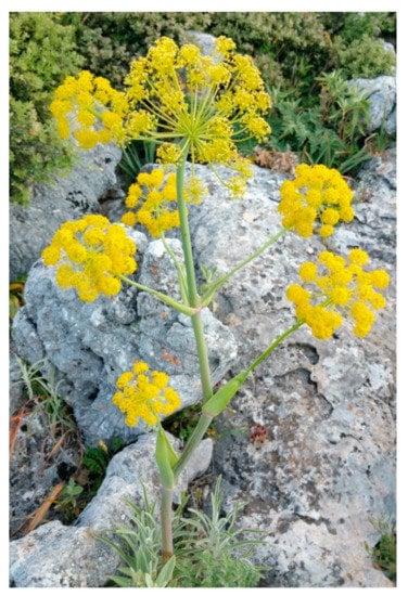 - Thapsia garganica, which belongs to a different genus (Thapsia plants are sometimes referred to as ‘deadly carrots’) but has visual similarities with silphium and pronounced pharmaceutical properties, including as a cancer treatment. Söderling-Brynolf (1970) also suggested this plant, which was called ‘drias’ among peasants in the region of Cyrene and regarded as poisonous for livestock [57]. Interestingly, Thapsia garganica bears a further resemblance to ancient silphium in that it is extremely resistant to seedling propagation and must be micropropagated [58]. Given its distribution in the Gebel Al Akhdar area of Libya, this plant is an increasingly good candidate plant for ancient silphium. In addition, Thapsia garganica (Figure 6) produces fruits in a similar shape to ancient silphium fruits depicted on the earliest silver coins of the Battiad dynasty (Figure 2).