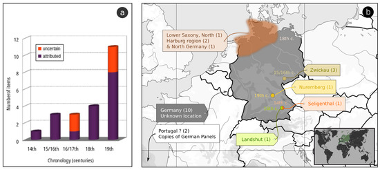 Chart with the number of analysed panels from each date/period (a) and map showing the place of origin of the studied panels, with the number of panels attributable to each location (b).