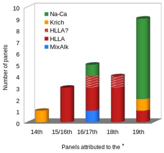 Moreover, the identified HLLA glass type in the one panel (PNP2563) attributed to the 19th century presents P2O5 and Fe2O3 content that is compatible with an earlier production (see Appendix B, Table A3). If that were the case, the panels could have been produced in the previous century to the attributed one. During the 19th century, from the gathered compositional information, glass sheet production was already incorporating the use of more purified materials, such as synthetic soda; this is in good agreement with the literature data from other European counterparts (e.g., Pradell et al. [3], Dungworth [38], Girbal and Dungworth [39]). Hence, a lower content (almost none) of potassium, magnesium aluminum and phosphorous oxides would be expected [3].