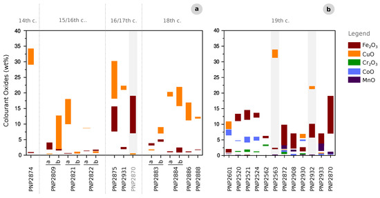 Most of the grisailles show a predominance of the copper as the main pigment, in particular among the panels attributed to the 14th to the 18th century. Concerning this period, the range of CuO and Fe2O3 on the analysed grisailles is shown in Figure 4a. In turn, the 19th century grisailles possess a more diverse composition, with the likely deliberate introduction of Cr, Co and Mn, as is visible in Table 1 and Figure 4b. Elements such as Zn and As were also detected, and these can relate either to the pigment components or to the base-glass composition, which will be further discussed. The panels PNP2870 and PNP2933 seem to fit well among the diversity of the latter chronology, where the main colourant is also iron oxide.