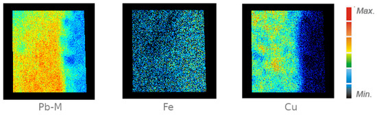 The 18th century grisailles characterised by PIXE mapping clearly show the dominance of Cu as the colourising element—Figure 5. The grisaille of PNP2884 (same for PNP2886 and PNP2888 analysed) can be easily perceived from Figure 5 as painted layer with an homogeneous distribution of Cu (colourant). The sharp line observed between the paint and the glass substrate clearly shows the differences in composition from glass to grisaille paint. The grisaille is not significantly richer in Fe compared to the glass substrate. This is in perfect accordance with the grisaille composition observed up to the 18th century in the panels from this study (see Appendix A, Table A1).