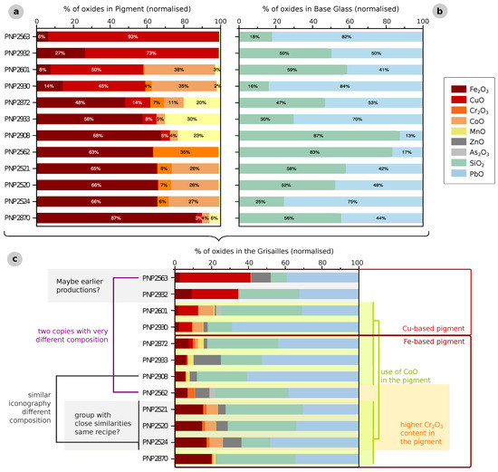 During the 19th century, a diversity of materials seems to have started to be used in the production of both the support glass and the painting materials. Concerning the grisailles paints, the spread of the use of dark enamels seems to have increased the risk of mis-attributions [2,5]. The introduction of other colourising elements in black painting materials (Zn, Co, Cr, Mn) increases between the 19th and the 20th centuries [2,3,5,44,45,46,47]. These elements (e.g., Co, Cr oxides) are not identified in recipes for the production of grisailles but are rather more typically in enamels [2,3,48]. Prior to the 19th century, the addition of MnO as a grisaille pigment seems to appear only in two recipes (Part II, Chap. LX and LXI) of the treatise Ars Vitraria Experimentalis by Johannes Kunckel (17th century) [1,2,49]. Due to the diversity in the 19th century grisailles’ compositions, Figure 6 presents a schematic view of the semi-quantified results—interpretation considers data limitations.