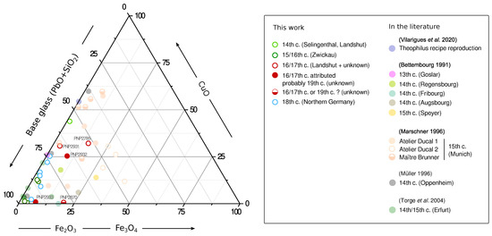 As mentioned previously, it was only possible to find a few studies reporting the characterisation of Germanic grisailles in the literature [6,7,8,10,11]. These studies mainly cover samples from the 13th to the 15th centuries, therefore making it easier to perform direct comparisons with the samples from the more recent chronology studies in this paper. The comparisons between the literature data and the results obtained for the 14th to 18th century panels are plotted in a ternary graph (Figure 7), reuniting the major constituents of the grisailles: the base-glass (SiO+PbO) and either the iron’s or the copper oxides’ contribution to the pigment colour. The data described in Verita [11] was not considered for the representation in Figure 7, since only the mean chemical composition of the glassy phase of the grisailles is presented in that study. The 19th century samples will be discussed latter, as this group presents a more complex composition.