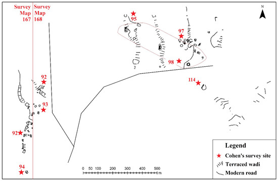The mapping project in this area focused on the terraced wadis and sites 92–94 on the left side of Figure 1 [7,8], and it also included the area of Horvat Haluqim. The numerous studies focused on the Horvat Haluqim site’s components in themselves represent almost all of the points in this article. These studies included archaeological surveys and excavations by Cohen [18] (sites 95, 97, 98, 114), [19] (pp. 41–45), [20], the long-term research by Bruins et al. [21,22,23,24], and the abiding interest that his conclusions aroused among the scholars specializing in remote sensing and among multidisciplinary scholars today [25] (pp. 63–66). Figure 2 and Figure 3 below are more representative of the methodological challenge related to maximizing archaeological data than they are of finding alternative conclusions.