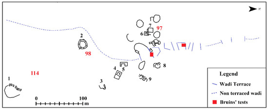 Following the work with Bruins [24], a preliminary test of the components of the Horvat Haluqim site, as Cohen had defined it, included a fortress, dwelling structures, and terraced wadis [18]. The preliminary test sufficed to confirm the assumption that the peripheries of terraced wadis had not been given sufficient attention. Among other things, two Early Bronze Age structures, mentioned in Figure 3, were identified, which were dated from periods that were also found in Bruins’ tests of the soil in the terraced wadi. As mentioned, to our understanding the soil in the wadi dates back to the periods of the sites on its periphery from where the soil was taken for building the terraces in the Umayyad period [9] (pp. 191–195).