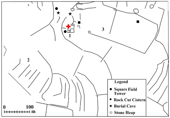 Figure 6 shows the following: (1) A structure identified here as a monastery (see below) measures about 9 × 13 m and consists of several rooms around a central courtyard. Square field towers are scattered close by, as are burial caves and water cisterns. (2) A terraced wadi about 80 m wide and several hundred meters long is shown. (3) On the slopes, stone walls marking agricultural plots can be identified, as well as paths that are about 1 m wide, some of which have been discussed [63] (p. 102).