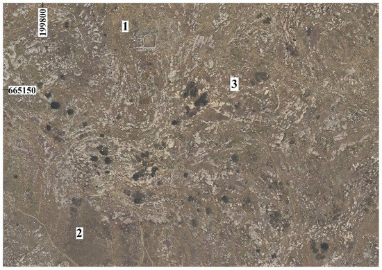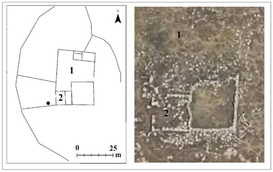 Figure 6, Figure 7 and Figure 8 below relate to the area on the periphery of Horvat Hamam to the south, which represents a small section of a large and densely sown area of settlements and their agricultural peripheries, and provides an opportunity to discuss the gap between the fieldwork of mapping the archaeological features and the option of relying exclusively on aerial photos. The gap between ground mapping as shown in Figure 6 and the orthophpto of Figure 7 of the same area is well reflected. Even the drone photos in the framework of the present project, taken south of the area here only after the field-walking survey, for the purpose of calculating surface runoff and soil accumulation, could not identify all the features that were essential for the purpose of the research (see [10]). In addition, Structure 1 in Figure 6, Figure 7 and Figure 8 represents the issue of identifying the head of the agricultural settlement. The finds indicate that all of the structures of this type that were excavated are monasteries scattered densely in the area. These types of structures were identified as monasteries as early as the 19th century, particularly the structure mentioned here [62] (p. 93), based on its architectonic quality as well as on segments of stone pillars, found in the same place to this day, as well as on scattered floor mosaic stones.
