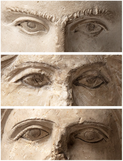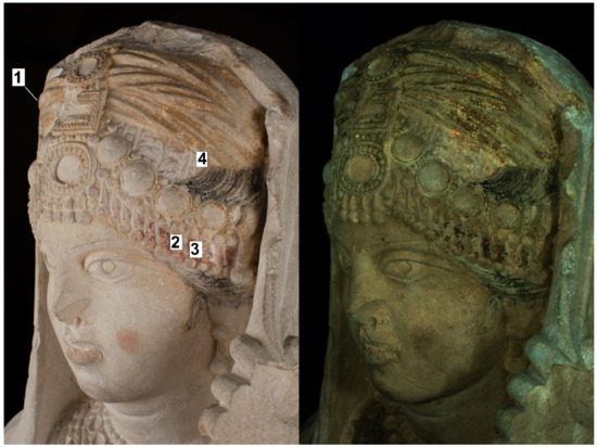 Research into ancient sculptural polychromy has rapidly expanded during the past two decades. Many research institutions and museums now carry out advanced investigations of the polychromy of various groups of ancient artefacts. Focus has tended to be on Greco-Roman marble sculpture and architecture, e.g., [6,7,8,9,10], although the polychromy of ancient terracotta artefacts, for example, as well as Egyptian artefacts [11], has also received far greater attention during recent years. Yet, many groups of artefacts of different materials and from various geographical areas and chronological periods have still not received much scrutiny.