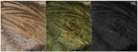VIL imaging is an effective technique for the detection of the synthetic pigment Egyptian blue. This colourant emits infrared (IR) radiation in the 800–1000 nm range (peak around 910 nm) with a very high quantum efficiency upon excitation in the visible range. The spatial distribution of the pigment can be documented by capturing its luminescent emission with an IR-sensitive camera [27].