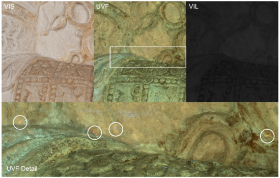 Revealing the presence and spatial distribution of fluorescing materials by illumination with high-frequency radiation within the UVA range (340–400 nm), UVF is routinely utilised for the examination and documentation of polychrome artefacts. It is particularly useful for visual detection of organic adhesives, binders, and surface coatings as well as lake pigments.