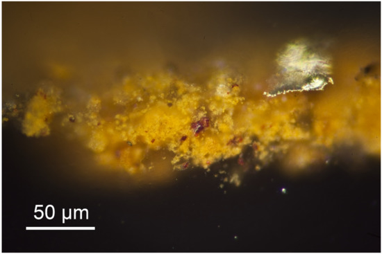 Samples were collected from paint traces representing the colours identified on each portrait. All samples, each no larger than a pinhead, were taken from fractured areas to minimise the damage caused by sampling. The samples were removed with a scalpel which was thoroughly cleaned with acetone prior to each sampling. Most of the specimens broke into smaller pieces during sampling. The pieces were documented with a handheld microscope and the most representative of them were selected for further processing. Each of the selected pieces was then placed in a mould on a bed of cured two-component epoxy resin. Owing to their minute size and fragile nature, most of the paint flakes were glued onto the surface with superglue before they were embedded in resin. After curing, the resin-embedded samples were polished manually on one side with increasing fineness (800–4000 grains/cm2) on a polishing machine using water as a lubricant and then with polishing pads (8000 and 12,000 grains/cm2). The finished cross-sections were examined at the NCG using a Leica DM2500M optical microscope (max 100×) in bright field (BF), dark field (DF), and UV. All observations were documented with a Canon EOS 5D Mark II camera mounted on the microscope.