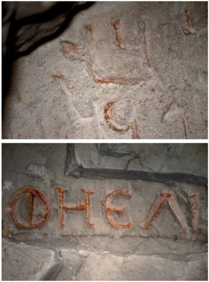 - Crupi, V.; La Russa, M.F.; Venuti, V.; Ruffolo, S.; Ricca, M.; Paladini, G.; Albini, R.; Macchia, A.; Denaro, L.; Birarda, G.; et al. A Combined SR-Based Raman and InfraRed Investigation of Pigmenting Matter Used in Wall Paintings: The San Gennaro and San Gaudioso Catacombs (Naples, Italy) Case. Eur. Phys. J. Plus 2018, 133, 369. [Google Scholar] [CrossRef]