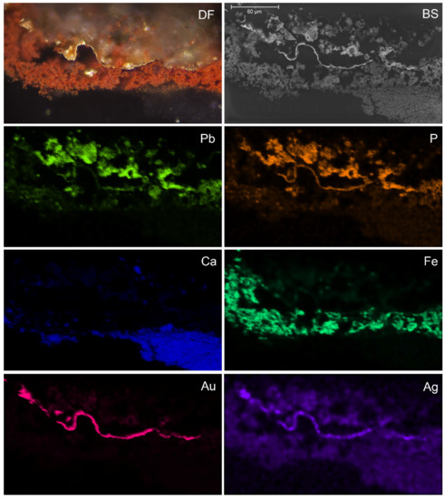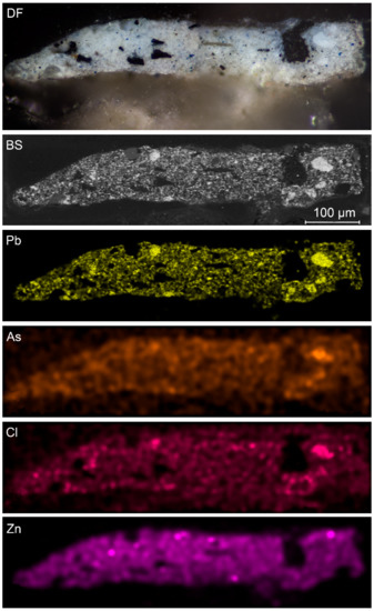 - Sanyova, J.; Cersoy, S.; Richardin, P.; Laprévote, O.; Walter, P.; Brunelle, A. Unexpected Materials in a Rembrandt Painting Characterized by High Spatial Resolution Cluster-TOF-SIMS Imaging. Anal. Chem. 2011, 83, 753–760. [Google Scholar] [CrossRef]