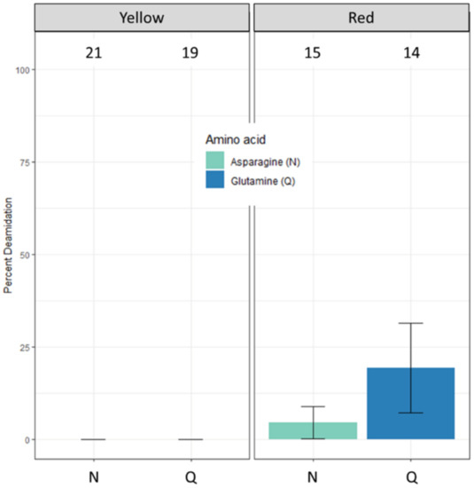 The deamidation level was calculated using a deamidation tool freely available on GitHub (https://github.com/dblyon/deamidation, accessed on 9 May 2022). The workflow of this tool is described in detail in Mackie et al. [28].