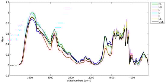 The writing paper samples, results, and classes are given in Table 1. Manufacture dates and sample letters are from the notes accompanying the collection. The number of samples in each class is: N (1), L (1), S (3), SL (1), GS (7), GL (6), GSL (2). There were unfortunately no samples that tested positive for gelatin only. Figure 1 shows an average spectrum for each class prior to preprocessing. The most obvious difference in spectra is the proteinaceous amide I and II peaks from 1550 to 1650 cm−1 for the GL, GS, and GSL classes. In the -OH stretching region from 3000–3400 cm−1, the slope of the GS spectrum is shallower than that of the other classes. The remaining variance across the spectra is less distinct and difficult to characterize by peak position and shape alone, hence the application of PCA. With data science classification techniques, such as PCA, it is not necessary to try to parse and assign each peak in a spectrum. The shape of the spectra can be viewed as a wholistic signature of a paper’s specific chemical composition. Spectral processing techniques such as the Kubelka-Munk or Kramers-Kronig transforms are not necessary if the PCA model is built with data that is collected in the same method as the data from the unknown objects.