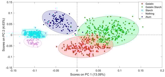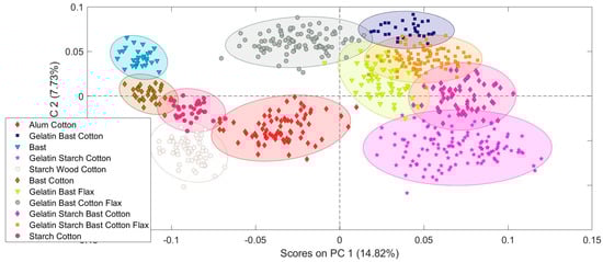 PCA model based on the sizing and fiber type information demonstrating the ability to distinguish mixed fiber papers.