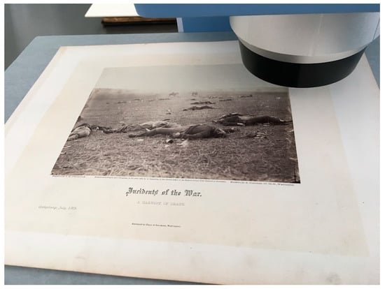 A loose print from Alexander Gardner’s Photographic Sketch Book of War undergoing the specular reflection FTIR data collection for analysis of the paper. Alexander Gardner, A Harvest of Death, Albumen Silver photograph mounted overall to cardstock, Harvard Art Museums/Fogg Museum, Richard and Ronay Menschel Fund for the Acquisition of Photographs, 2008.22.