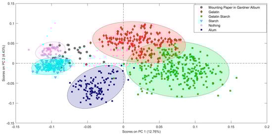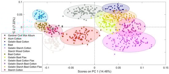 Some of the classes are adjacent or slightly overlapping in PCA space, but there are surprisingly clear groups for the different mixtures that range from one to five components. In very broad strokes, PC1 picks up mostly on the variance due to gelatin content and PC2 picks up on variance due to bast content. While the confidence ellipses of the different fiber mixtures are slightly overlapping, multiple measurements from an object can give more confidence in the assignment of an unknown sample to a specific class. Spectra from the Gardner album do not align neatly with any one reference group, but appear to contain elements of gelatin, bast, cotton, starch, and flax (Figure 7). The fact that an almost unlimited number of specular reflection FTIR measurements can be taken from multiple positions on a collections object is a clear advantage. Other data science techniques such as a support vector machine discriminant analysis (SVMDA) may be a better choice for data that has such close boundaries, but exploration of that will be left for future work.
