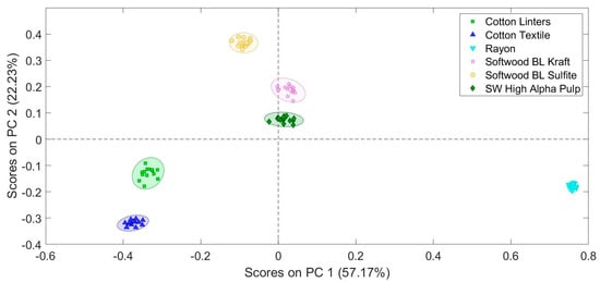 The reference materials of pure pulp stock were provided by Walter Rantanen of SGS-IPS testing, and include cotton linter fibers, cotton textile fibers, rayon fibers, softwood bleached (BL) kraft fibers, softwood bleached (BL) sulfite fibers, and softwood high alpha pulp fibers. Somewhat surprisingly, the different cellulose fiber types neatly split out into different groups (Figure 5). Even extremely similar fibers such as cotton linters (short fibers of the cotton boll) and cotton textile fibers (lint, the long cotton fibers commonly used in textiles) separated in PCA space.