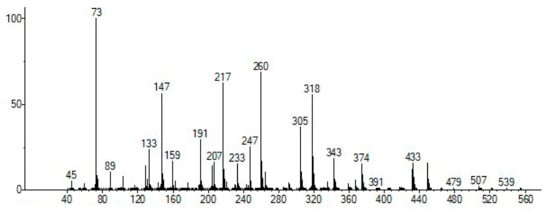 Above: Mass spectrum of the most abundant component (peak at 33.3 min) in sample T6, blackened Acacia gum from Ernetta Island. Below: Mass spectrum for D-Pinitol, pentakis (trimethylsilyl) ether from NIST/EPA/NIH Mass Spectral Library (NIST 17) and NIST Mass Spectral Search Program (Version 2.3) from the NIST Mass Spectrometry Data Center, Gaithersburg, MD, USA.