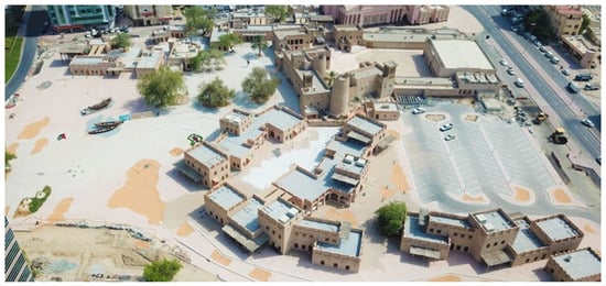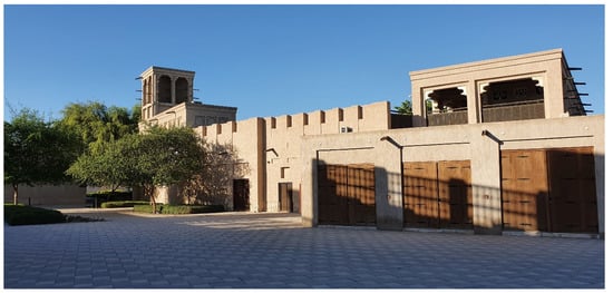 The United Arab Emirates was founded as a federation in 1971, including seven united Emirates [18]. Due to the unprecedented urbanization processes and rapid economic growth, most of the significant architectural legacy in some historic districts along the coast was swept away [19,20]. After the disappearance of most of the UAE’s fragile urban heritage, the UAE began to search for its past and cultural heritage. During the late 1970s and early 1980s, all governments of the seven Emirates started to protect and develop the irretrievable historical districts towards achieving the shared national goal of boosting heritage tourism [21]. At least one historical district is present in each Emirate, usually a complex of original heritage buildings and a replica of traditional houses, markets, and public spaces [22].