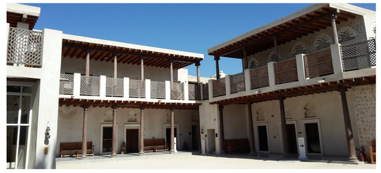 Sharjah Art Foundation (SAF)’s galleries are also placed in the Heart of Sharjah to display the cultural identity (Figure 10). These art spaces are aimed to reactivate the Heart of Sharjah through contemporary art that enriches the socio-cultural context of Sharjah. SAF provides five galleries of restored buildings with minimal interior exhibition spaces and various exterior exhibition spaces such as courtyards, sikkahs, pocket parks, and an inter-connected roofscape [64]. It was a suitable reinterpretation of balance between the historical context and contemporary art to showcase the Bedouin style of living within the courtyard house typology [65]. This subtle design approach enables sustaining the past by reusing old houses and creating functional spaces for social and spatial functions while enjoying contemporary art [66].