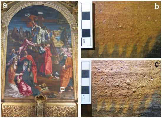 The Descent from the Cross by Pedro Nunes, 1620, Esporão Chapel, Évora’s Cathedral, Portugal, (a) and a surface detail of the orange cloak (marked with a white rectangle) under incident (b) and raking light (c).