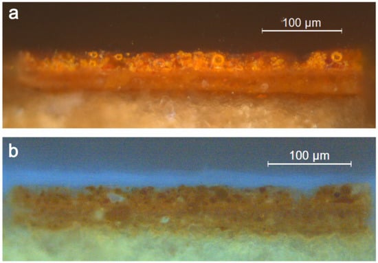The two cross-sections examined under the optical microscope showed a similar structure with a first underlayer of ochre colour with a thickness of 25–30 µm, covered by a bright orange paint, of around the same thickness, with bright orange particles without UV fluorescence (Figure 2). Among these particles, it is possible to distinguish spherical particles and particles of irregular or undefined shapes (OM). The former have a diameter of up to about 15 μm, while irregularly shaped particles can, in some cases, reach 40 μm in their largest dimension. Some of the spherical particles show a brighter outer shell than the core (Figure 2).