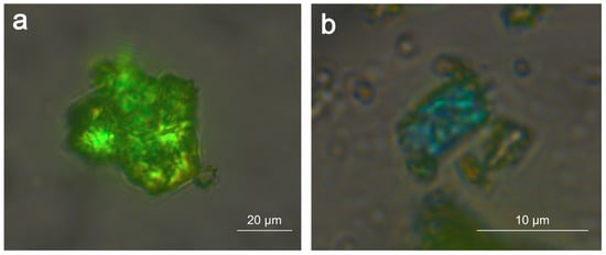 Examination of the top bright orange layer under the petrographic microscope reveals that some particles show intense green (Figure 3a) or blue (Figure 3b) interference colours.